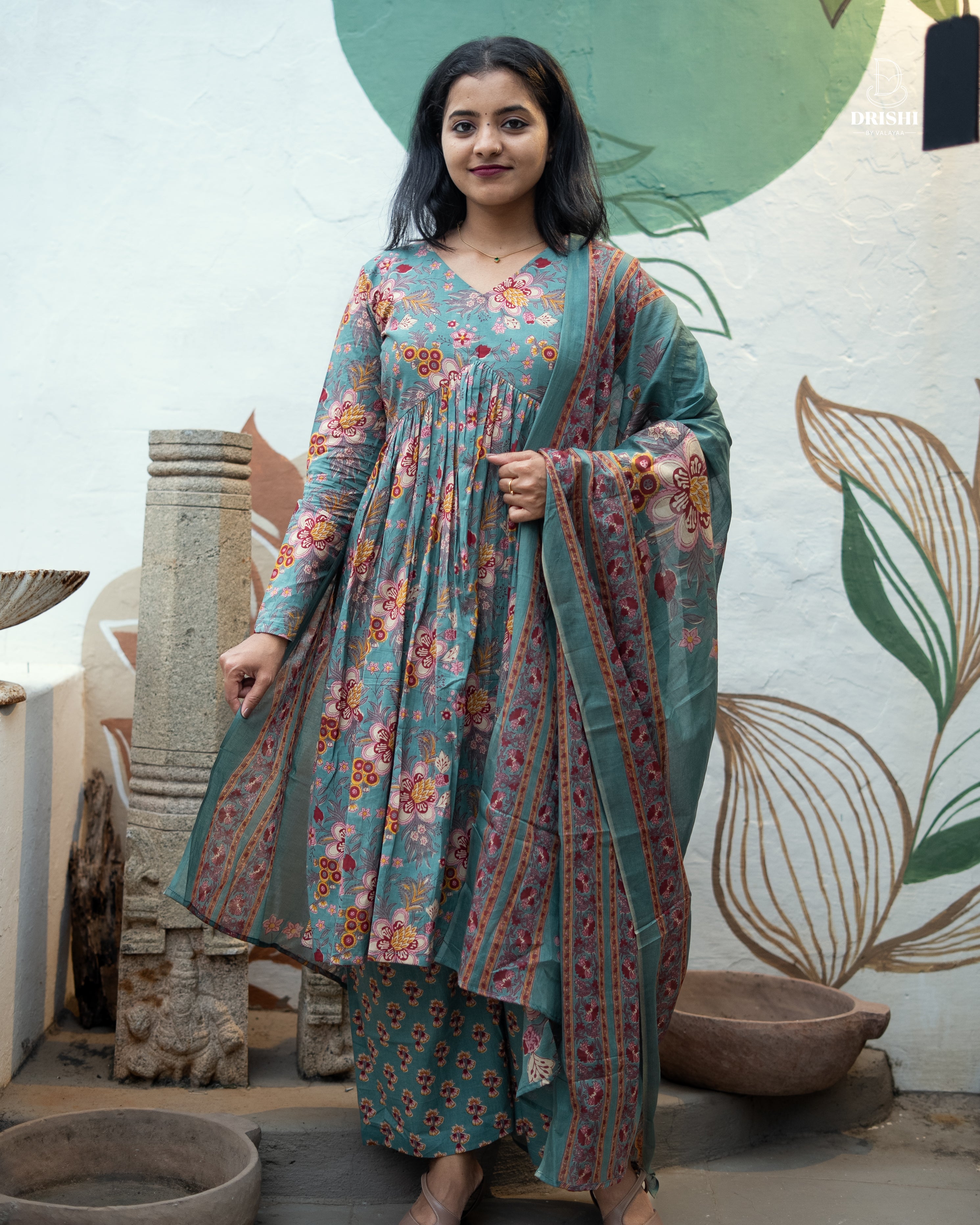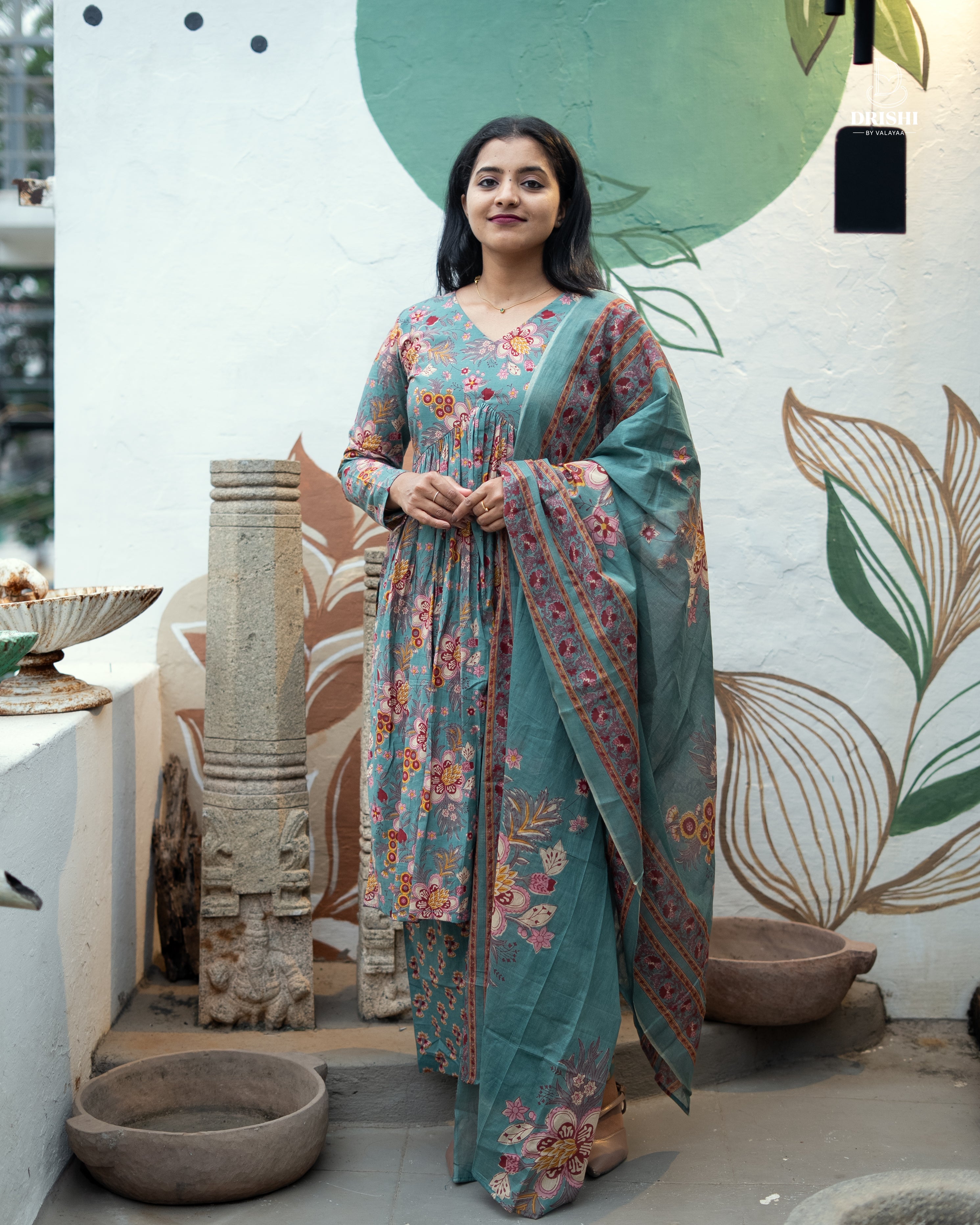 A graceful teal kurta set adorned with delicate floral prints that bloom beautifully across the fabric. Designed with a flattering V-neck and soft gathers that add flow and elegance, this outfit is paired with a perfectly coordinated printed bottom and a lightweight dupatta with intricate border detailing. The soothing color palette and timeless floral charm make it ideal for festive days, casual celebrations, or elegant everyday wear. Effortless, feminine, and endlessly graceful