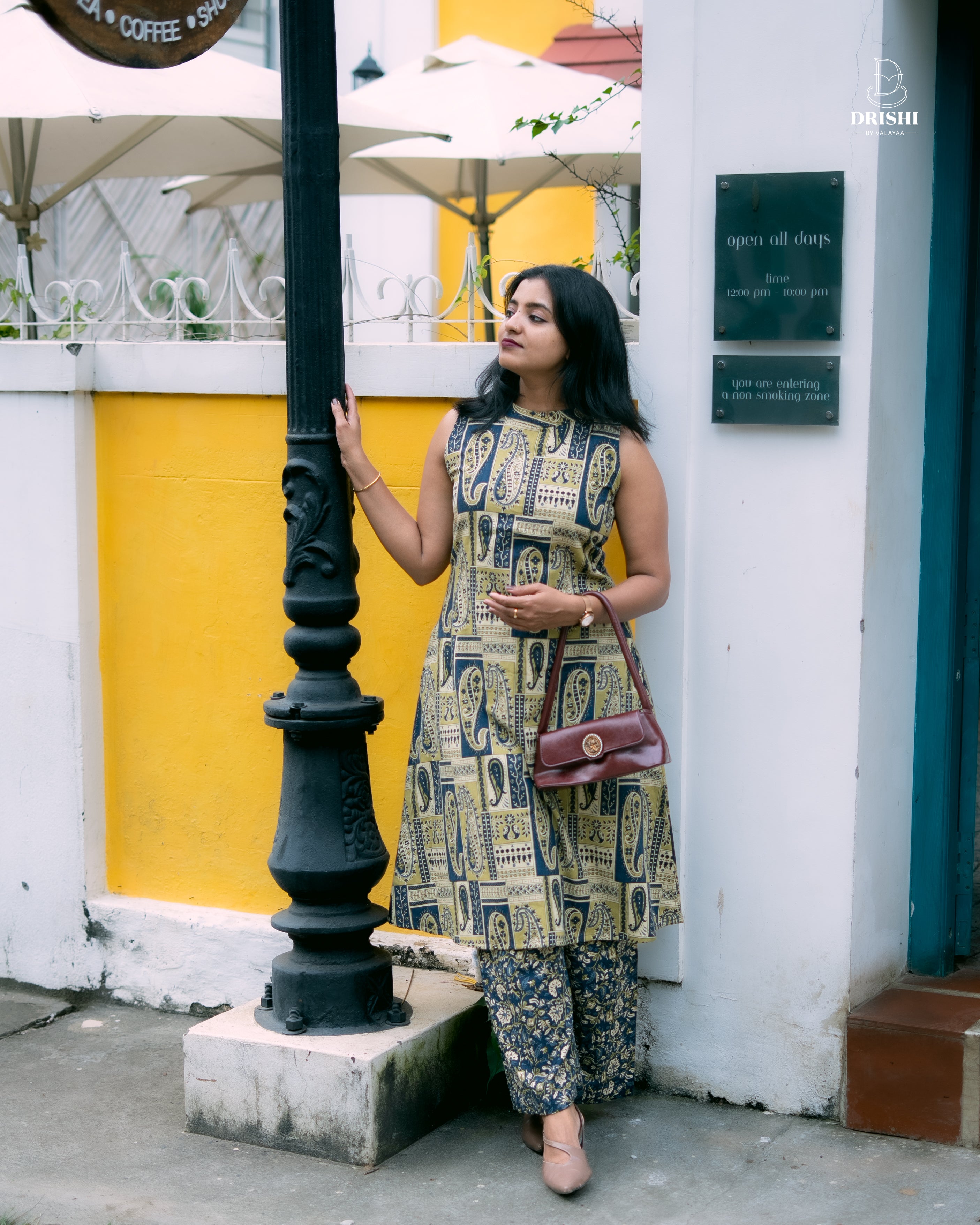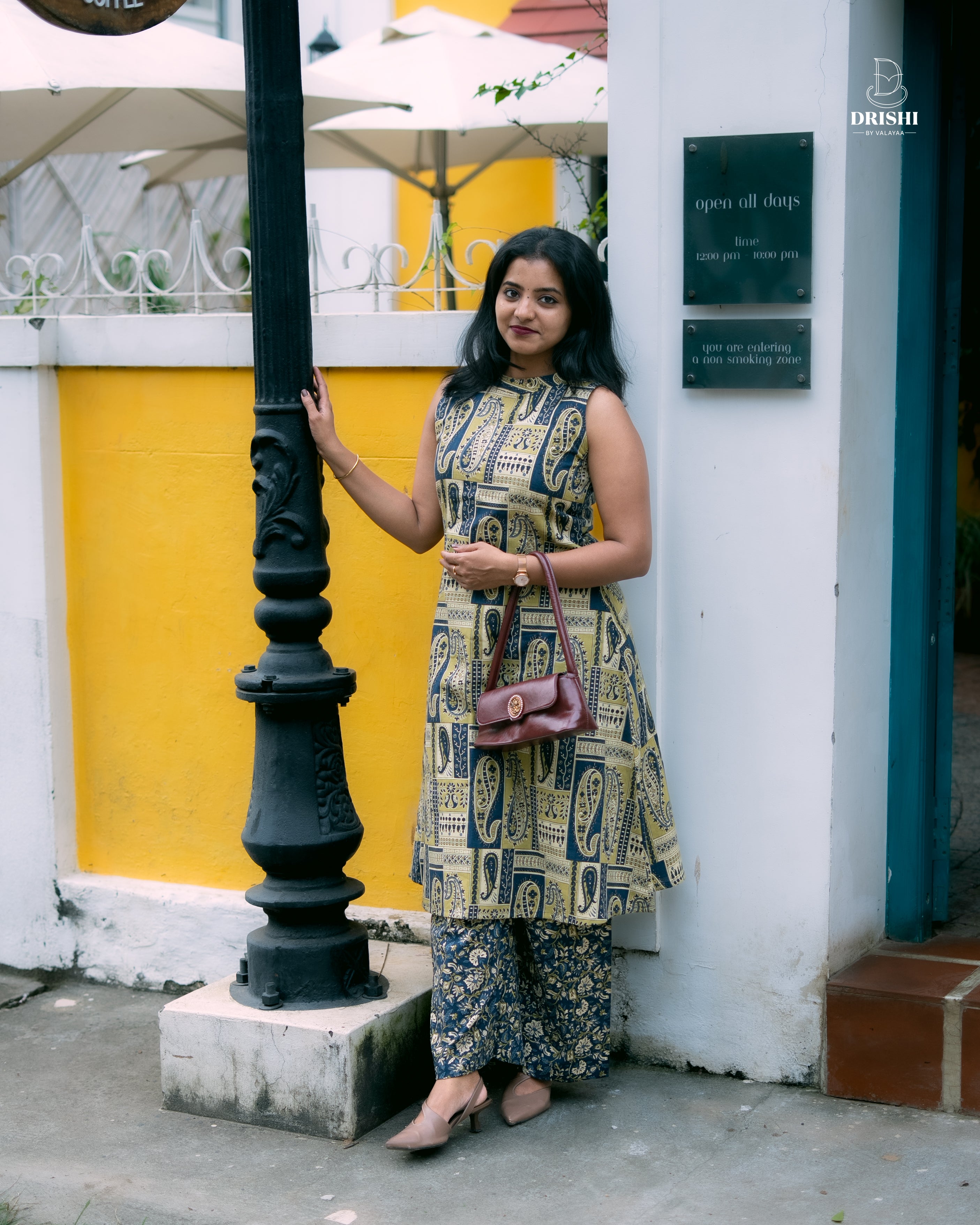 A timeless kurti set crafted in rich indigo tones with classic paisley motifs, paired beautifully with a printed straight-fit bottom. Designed for comfort and elegance, this outfit blends traditional charm with a modern silhouette  perfect for office wear, casual outings, or relaxed festive days.