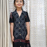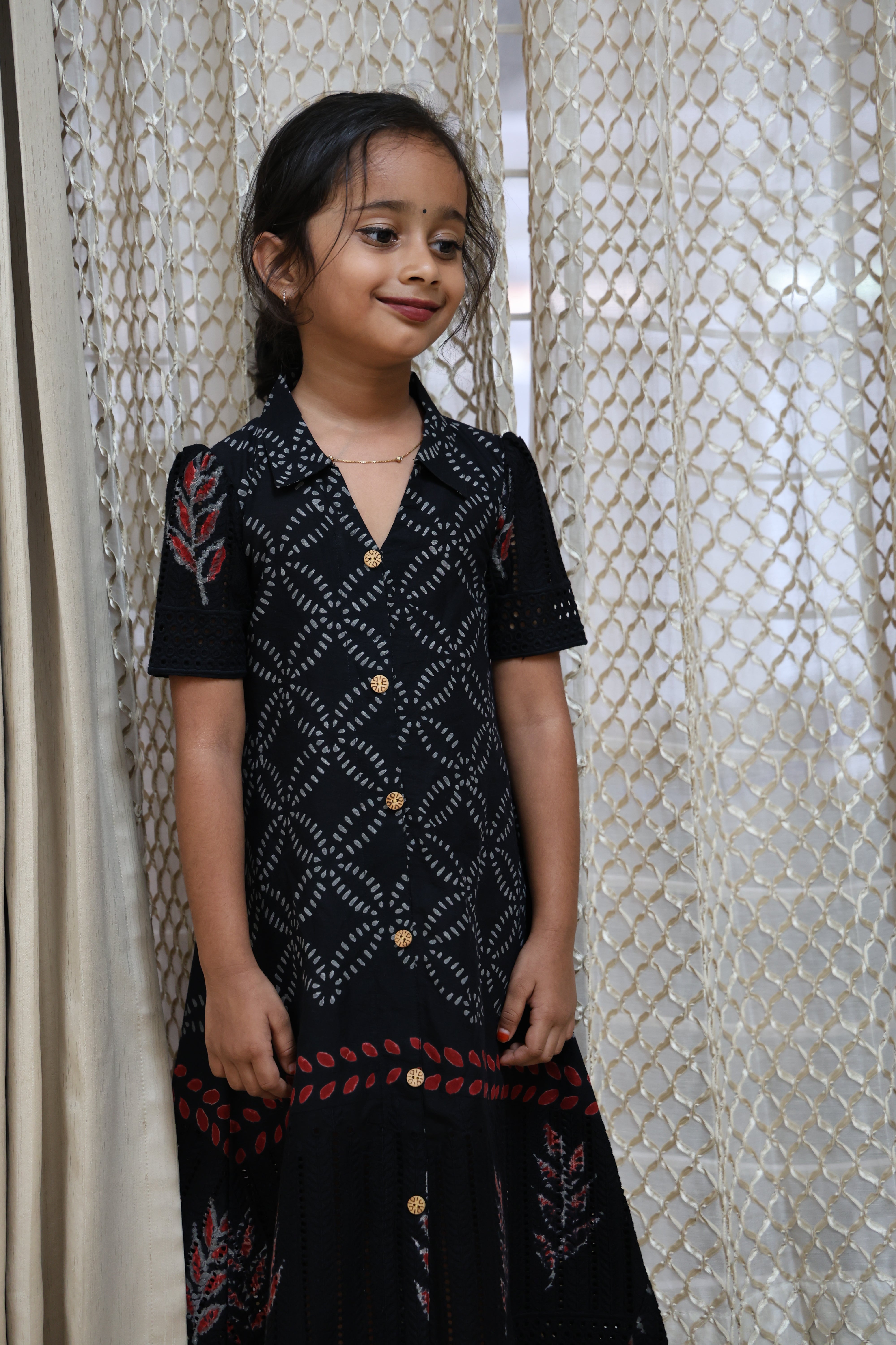 A touch of charm in every stitch the Twilight Grace Dress blends elegance and comfort in one! Crafted in soft cotton with delicate red and white thread patterns, this black beauty stands out with its button-down front and cute puff sleeves. Perfect for evening outings or festive gatherings, it brings out your little one’s graceful charm effortlessly.