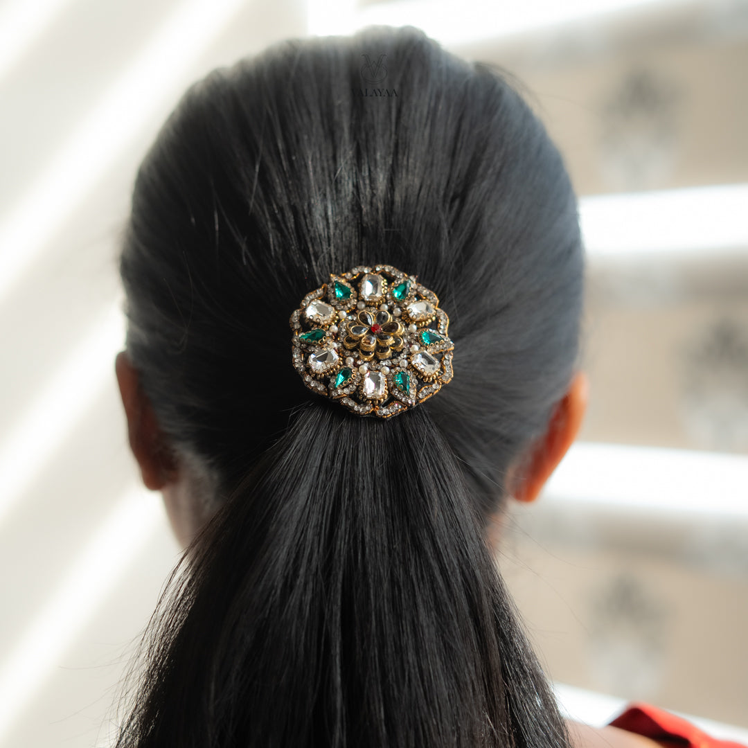 A regal round motif adorned with emerald green stones, pearls, and antique gold detailing  perfect to elevate festive and bridal hairstyles with royal charm.