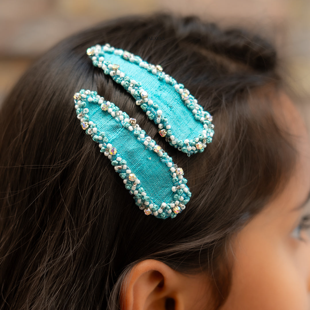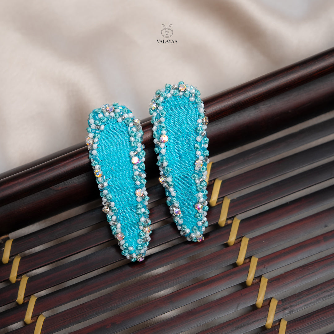 Bright and elegant, the Sea Mist Tictac  are handcrafted in a refreshing aqua blue fabric and delicately bordered with shimmering beads and crystal accents. Their clean, minimal design with subtle sparkle makes them perfect for both everyday wear and special occasions.