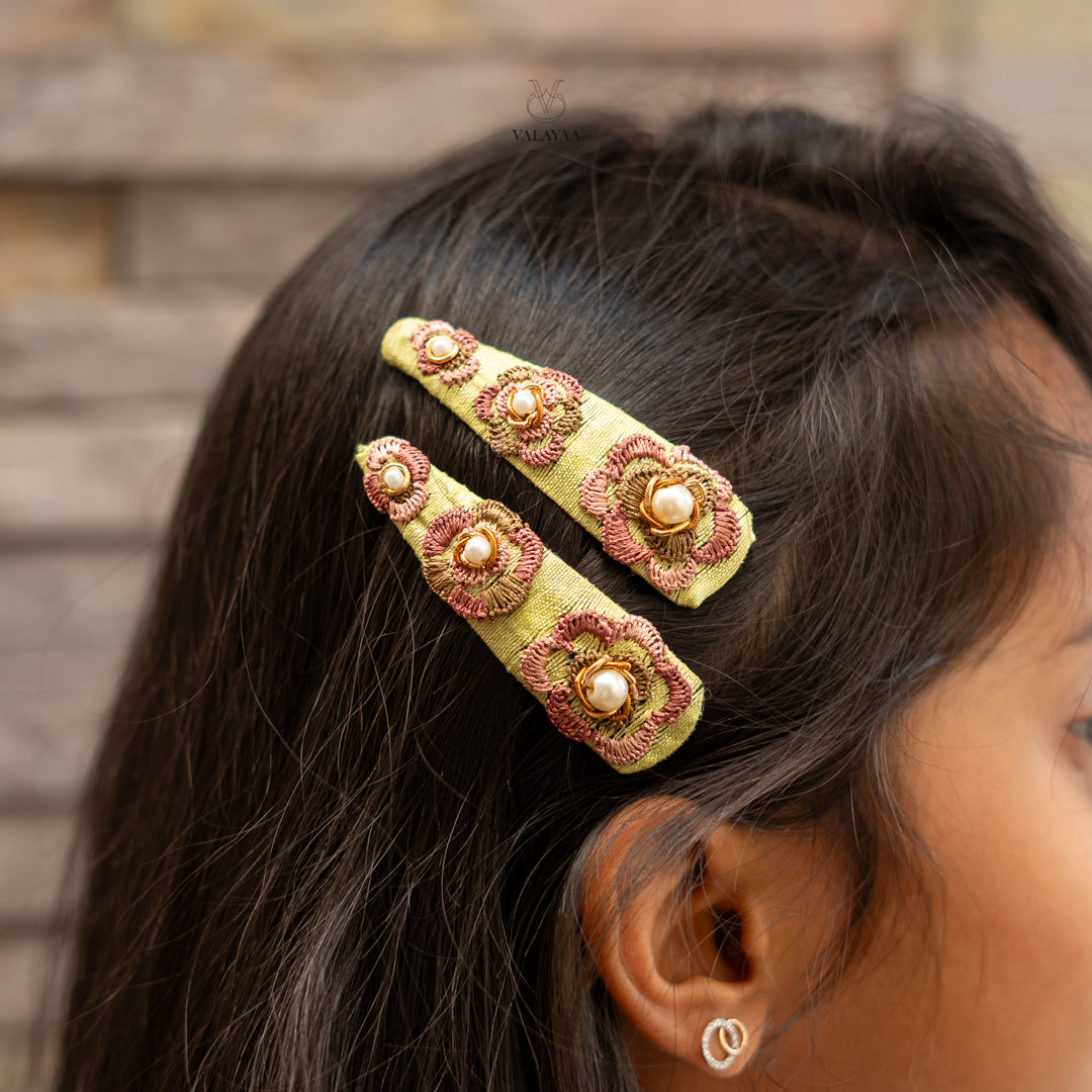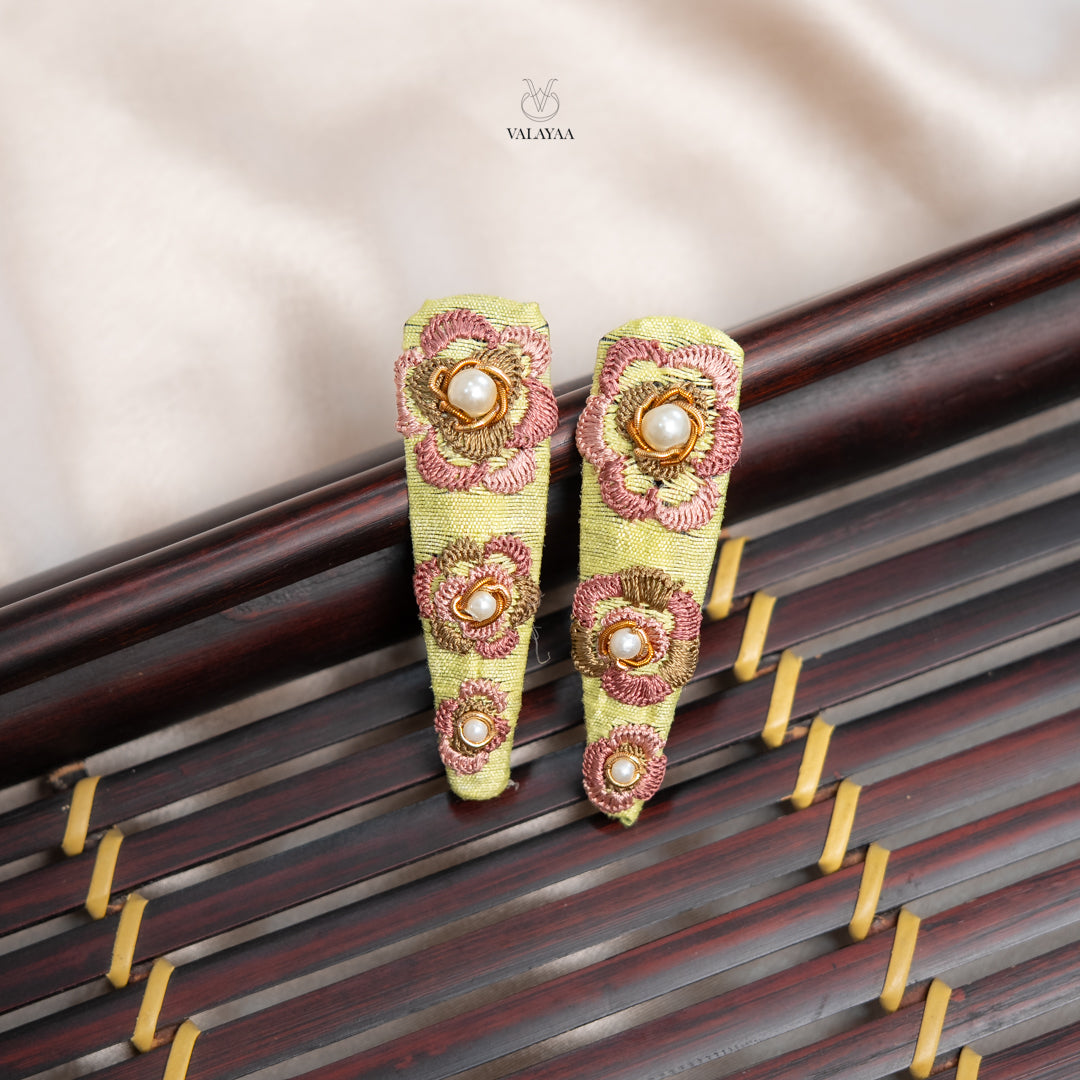 Delicately handcrafted, Spring Aura Tictac feature a soft pastel green base adorned with intricate floral embroidery in blush pink and gold tones. Finished with elegant pearl centers, these clips bring a graceful, feminine charm to any hairstyle