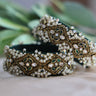 Add a regal charm to your festive look with this intricately designed handcrafted bangle. Featuring a deep green base, it is beautifully adorned with tiny pearls, shimmering white stones, and antique gold detailing. The unique diamond-shaped motifs embellished with green and white stones bring out a traditional yet luxurious appeal. Perfect for weddings, festive occasions, or gifting, this statement bangle effortlessly elevates any ethnic attire.